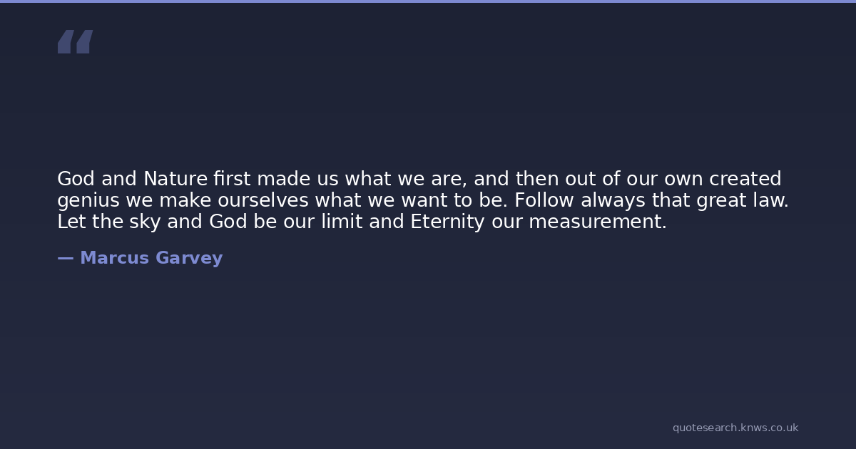 God and Nature first made us what we are, and then out of our own created genius we make ourselves what we want to be. Follow always that great law. Let the sky and God be our limit and Eternity our measurement.