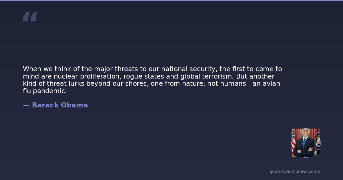 When we think of the major threats to our national security, the first to come to mind are nuclear proliferation, rogue states and global terrorism. But another kind of threat lurks beyond our shores, one from nature, not humans - an avian flu pandemic.