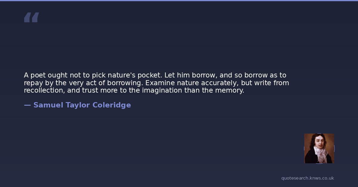 A poet ought not to pick nature's pocket. Let him borrow, and so borrow as to repay by the very act of borrowing. Examine nature accurately, but write from recollection, and trust more to the imagination than the memory.