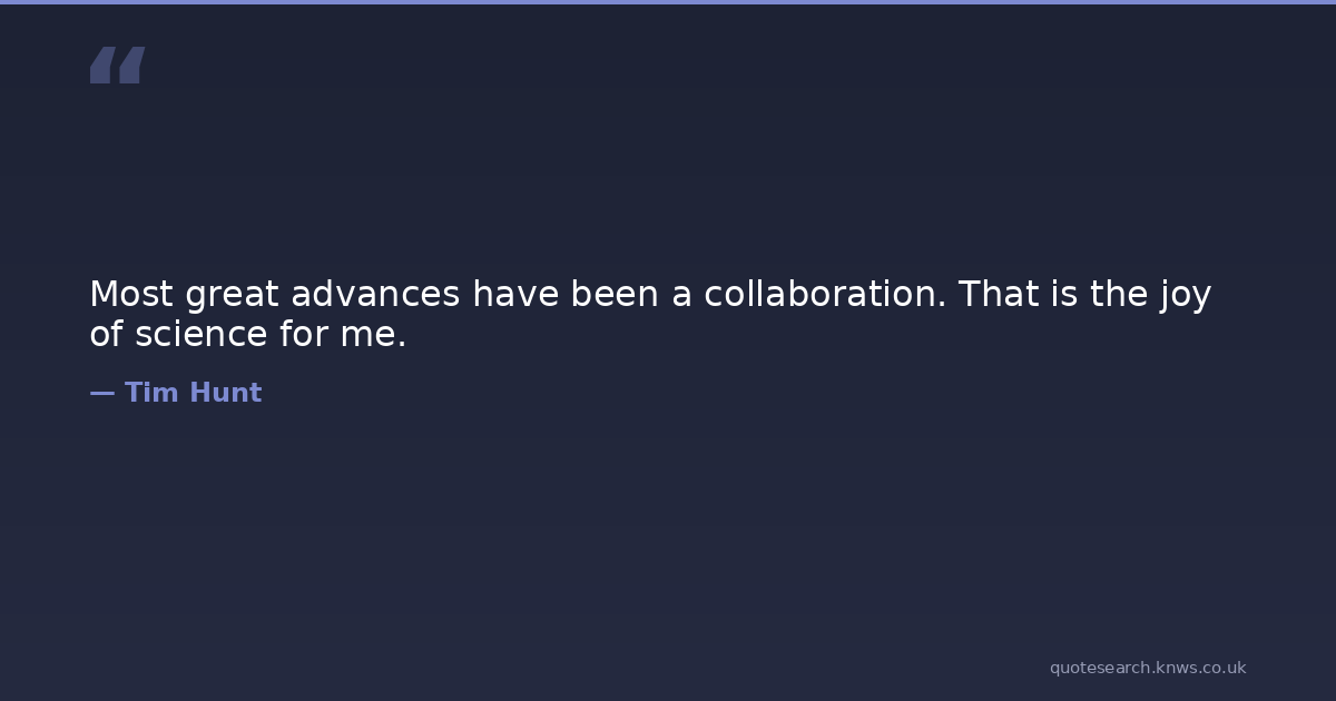 Most great advances have been a collaboration. That is the joy of science for me. Great Collaboration Joy Download Image Share on X Share on Facebook Copy Link