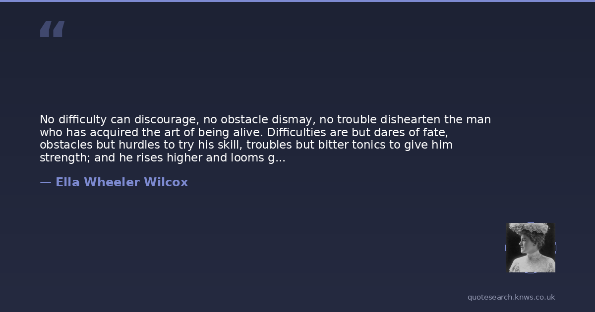 No difficulty can discourage, no obstacle dismay, no trouble dishearten the man who has acquired the art of being alive. Difficulties are but dares of fate, obstacles but hurdles to try his skill, troubles but bitter tonics to give him strength; and he rises higher and looms greater after each encounter with adversity.