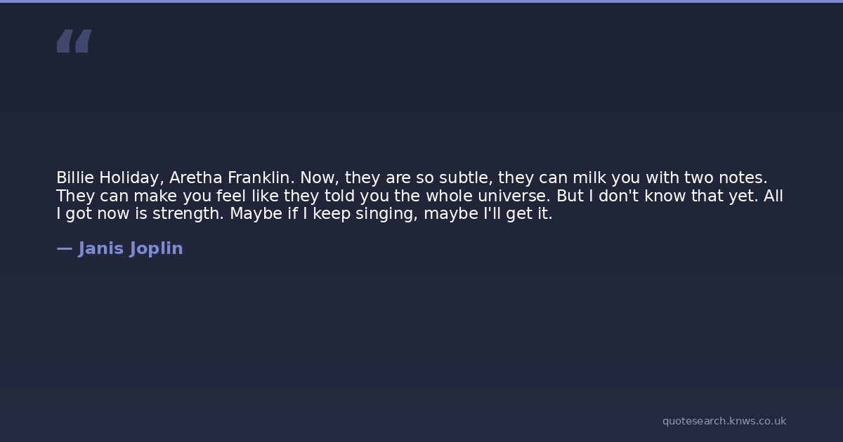 Billie Holiday, Aretha Franklin. Now, they are so subtle, they can milk you with two notes. They can make you feel like they told you the whole universe. But I don't know that yet. All I got now is strength. Maybe if I keep singing, maybe I'll get it.