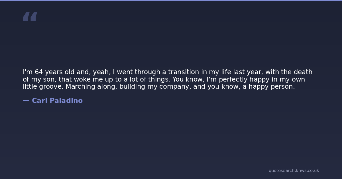I'm 64 years old and, yeah, I went through a transition in my life last year, with the death of my son, that woke me up to a lot of things. You know, I'm perfectly happy in my own little groove. Marching along, building my company, and you know, a happy person.