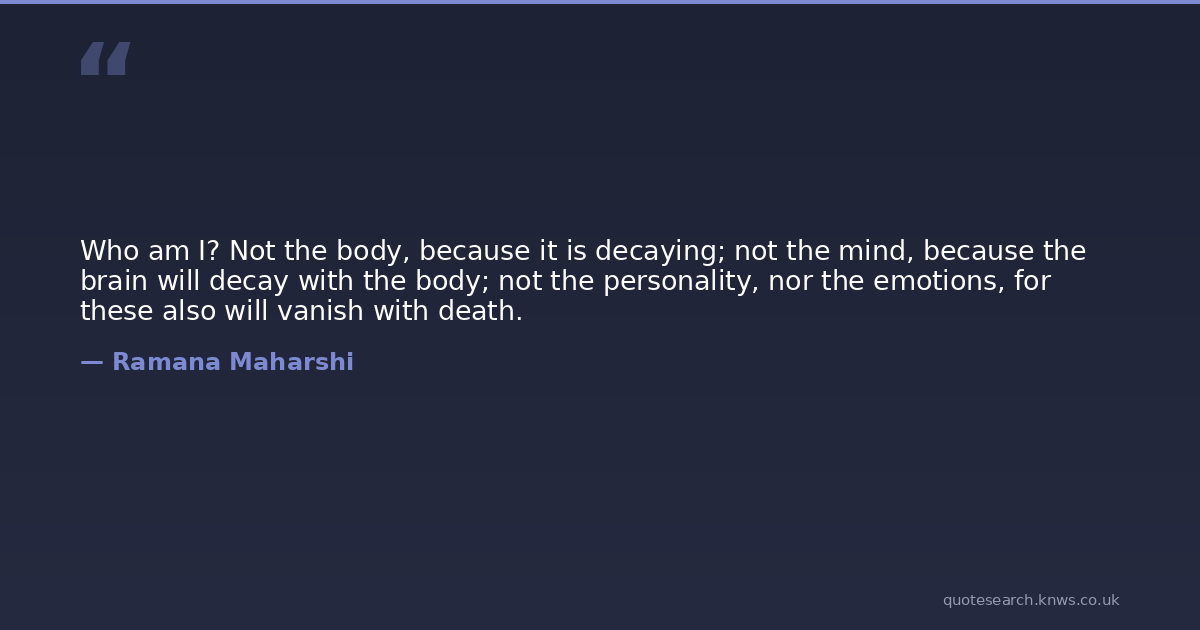 Who am I? Not the body, because it is decaying; not the mind, because the brain will decay with the body; not the personality, nor the emotions, for these also will vanish with death.