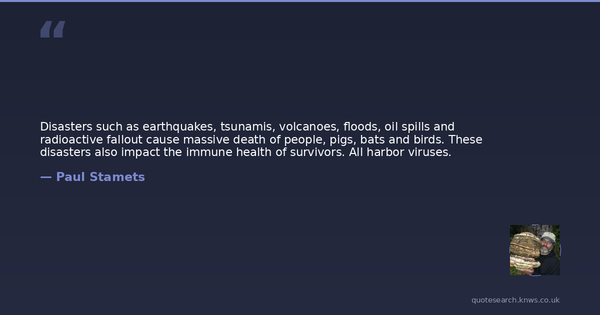 Disasters such as earthquakes, tsunamis, volcanoes, floods, oil spills and radioactive fallout cause massive death of people, pigs, bats and birds. These disasters also impact the immune health of survivors. All harbor viruses.