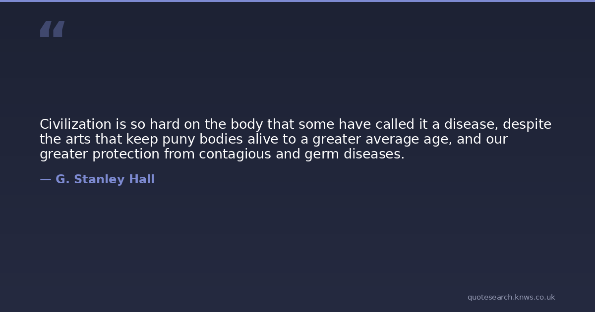 Civilization is so hard on the body that some have called it a disease, despite the arts that keep puny bodies alive to a greater average age, and our greater protection from contagious and germ diseases.