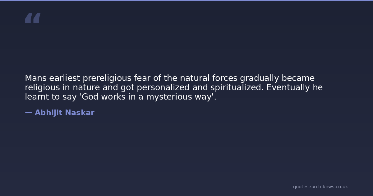 Mans earliest prereligious fear of the natural forces gradually became religious in nature and got personalized and spiritualized. Eventually he learnt to say 'God works in a mysterious way'.