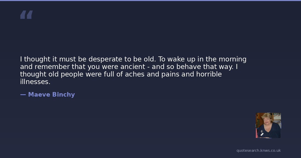 I thought it must be desperate to be old. To wake up in the morning and remember that you were ancient - and so behave that way. I thought old people were full of aches and pains and horrible illnesses.