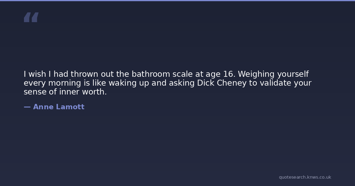 I wish I had thrown out the bathroom scale at age 16. Weighing yourself every morning is like waking up and asking Dick Cheney to validate your sense of inner worth.