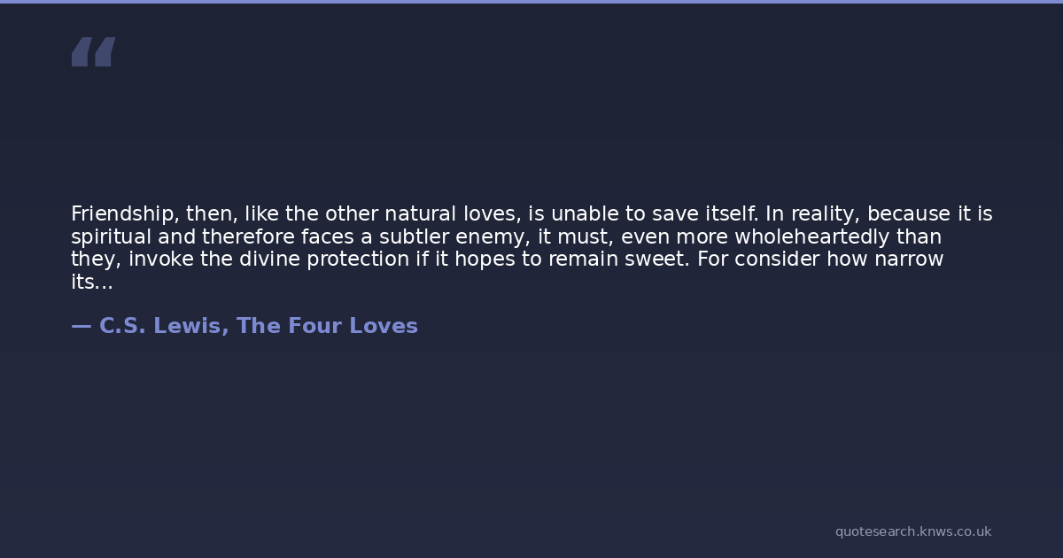 Friendship, then, like the other natural loves, is unable to save itself. In reality, because it is spiritual and therefore faces a subtler enemy, it must, even more wholeheartedly than they, invoke the divine protection if it hopes to remain sweet. For consider how narrow its true path is. Is must not become what the people call a "mutual admiration society"; yet if it is not full of mutual admiration, of Appreciative love, it is not Friendship at all.