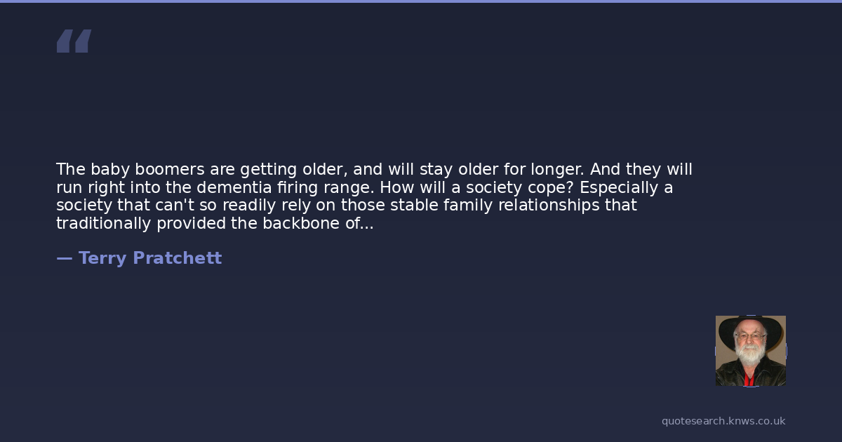 The baby boomers are getting older, and will stay older for longer. And they will run right into the dementia firing range. How will a society cope? Especially a society that can't so readily rely on those stable family relationships that traditionally provided the backbone of care?