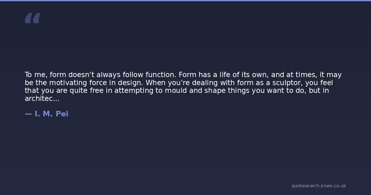 To me, form doesn't always follow function. Form has a life of its own, and at times, it may be the motivating force in design. When you're dealing with form as a sculptor, you feel that you are quite free in attempting to mould and shape things you want to do, but in architecture, it's much more difficult because it has to have a function.