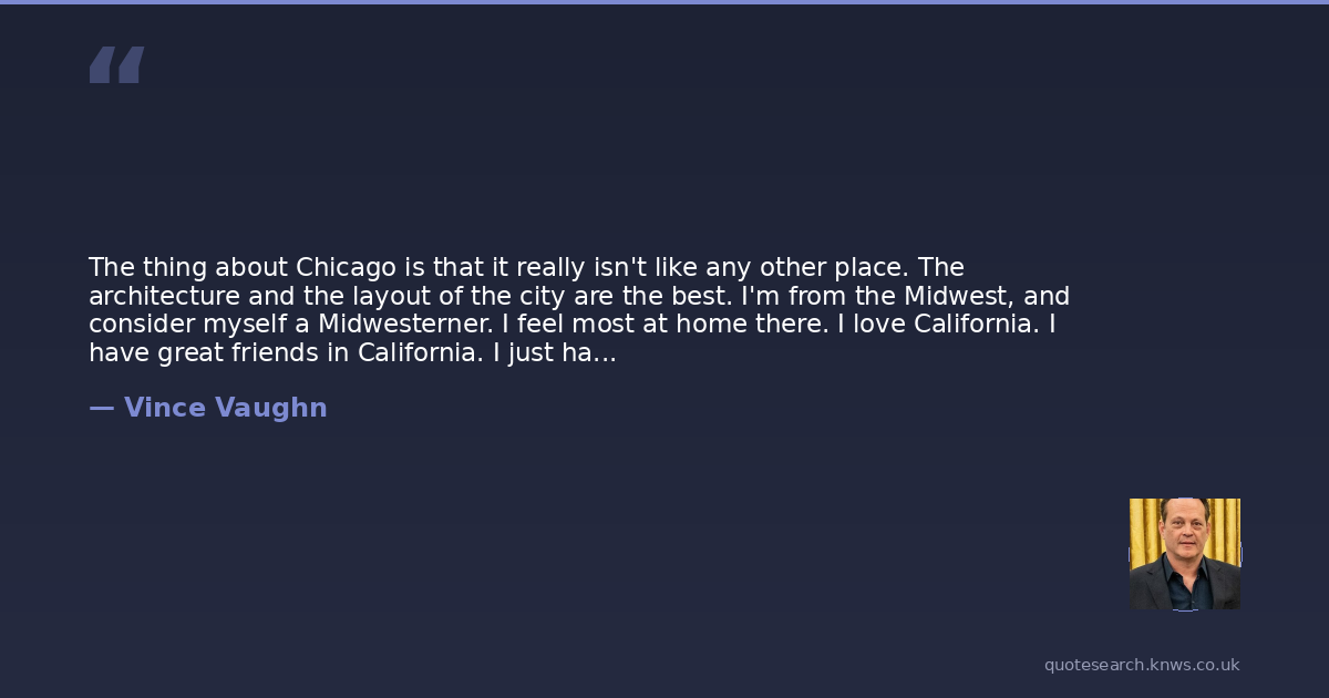 The thing about Chicago is that it really isn't like any other place. The architecture and the layout of the city are the best. I'm from the Midwest, and consider myself a Midwesterner. I feel most at home there. I love California. I have great friends in California. I just have always considered Illinois to be home.
