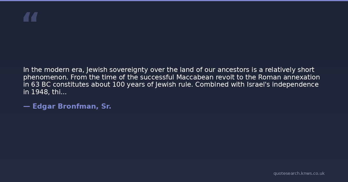 In the modern era, Jewish sovereignty over the land of our ancestors is a relatively short phenomenon. From the time of the successful Maccabean revolt to the Roman annexation in 63 BC constitutes about 100 years of Jewish rule. Combined with Israel's independence in 1948, this is about 160 years of effective sovereignty.
