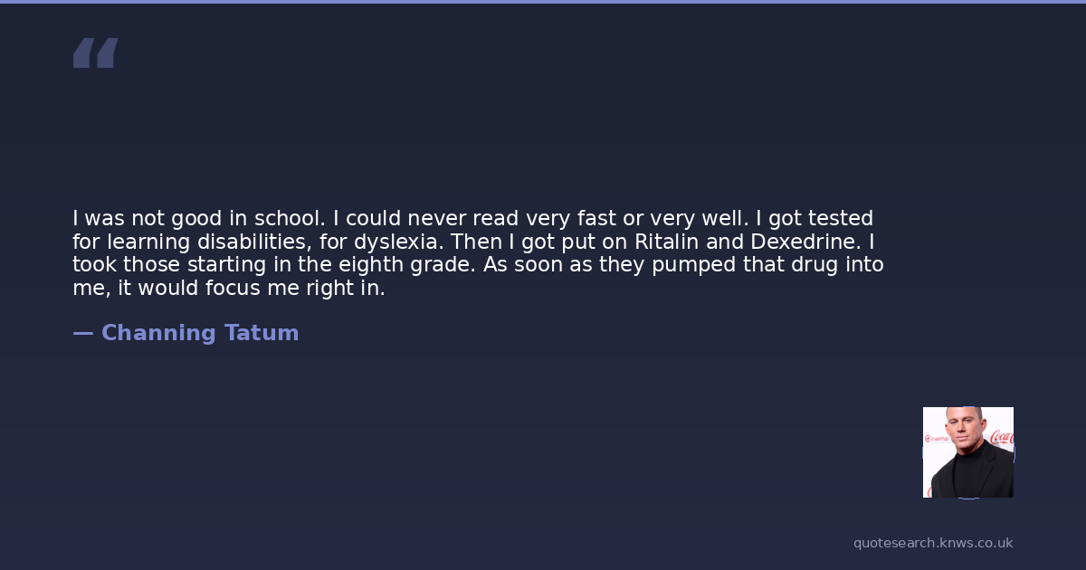 I was not good in school. I could never read very fast or very well. I got tested for learning disabilities, for dyslexia. Then I got put on Ritalin and Dexedrine. I took those starting in the eighth grade. As soon as they pumped that drug into me, it would focus me right in.
