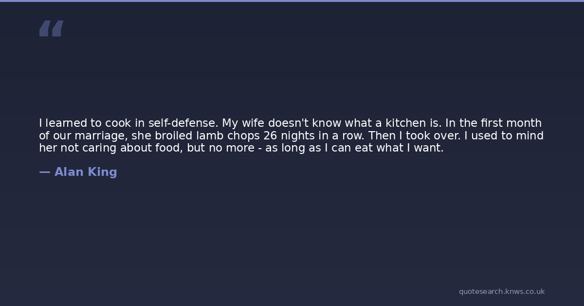I learned to cook in self-defense. My wife doesn't know what a kitchen is. In the first month of our marriage, she broiled lamb chops 26 nights in a row. Then I took over. I used to mind her not caring about food, but no more - as long as I can eat what I want.