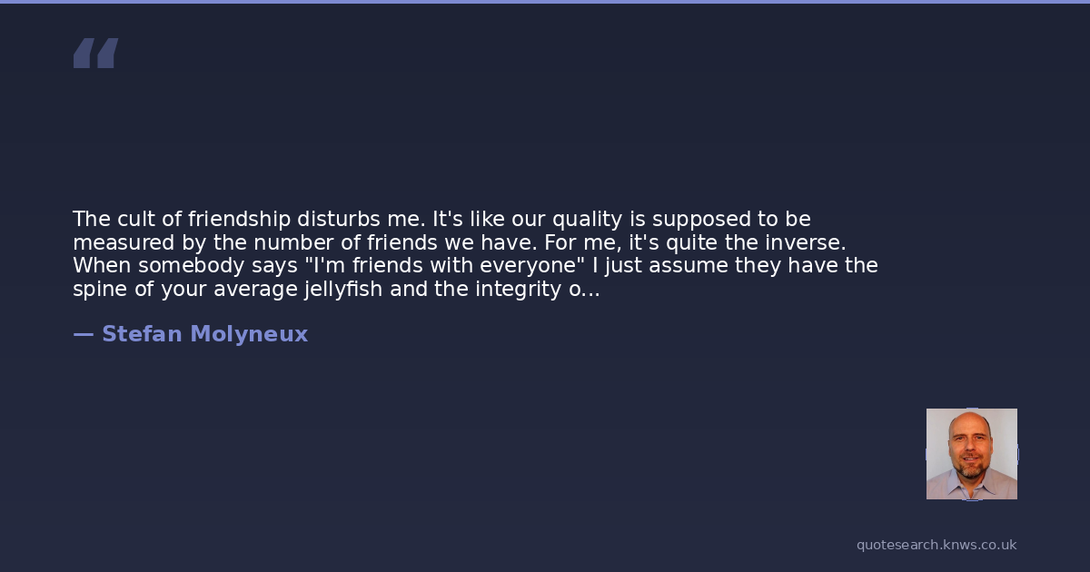 The cult of friendship disturbs me. It's like our quality is supposed to be measured by the number of friends we have. For me, it's quite the inverse. When somebody says "I'm friends with everyone" I just assume they have the spine of your average jellyfish and the integrity of your average soap dish. "I have tons of close friends!" Ok, then you obviously have no standards. "I've slept with lots of people!" Good, I will shake your hand from inside this Hazmat suit. It's like you have to have friends or you're nothing, and you gotta have lots of friends, and the more friends you have the more value you have. This Is a way of lowering our standards to fit in. I'm a big fan of quality over quantity. Everyone wants to look at their life like it's a beer commercial they can just climb into. The larger the circle of friends the more alcohol is involved to blind yourself to the fact that you cant stand most of these assholes.