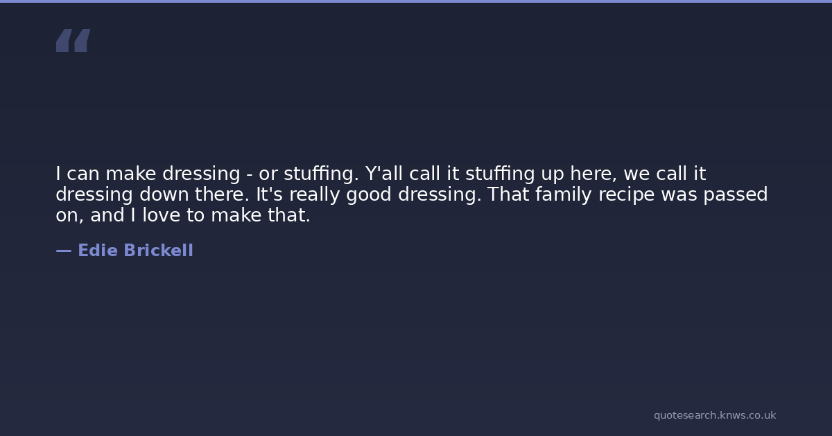 I can make dressing - or stuffing. Y'all call it stuffing up here, we call it dressing down there. It's really good dressing. That family recipe was passed on, and I love to make that.