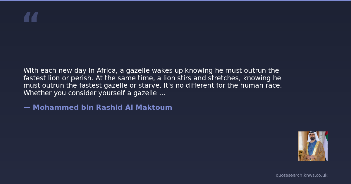 With each new day in Africa, a gazelle wakes up knowing he must outrun the fastest lion or perish. At the same time, a lion stirs and stretches, knowing he must outrun the fastest gazelle or starve. It's no different for the human race. Whether you consider yourself a gazelle or a lion, you have to run faster than others to survive.