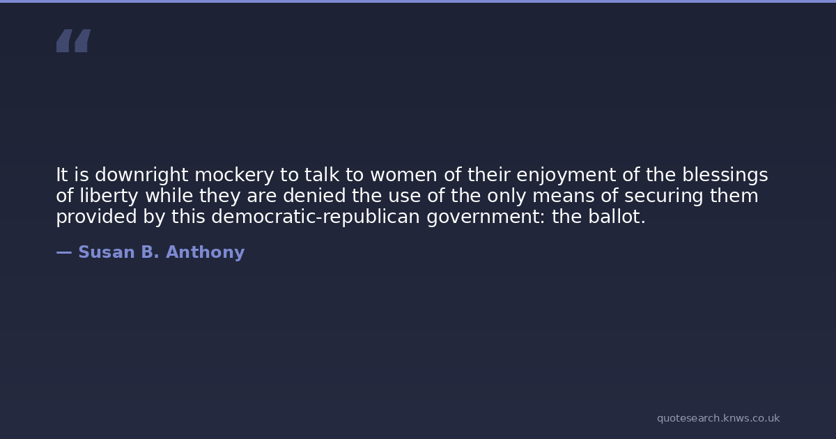 It is downright mockery to talk to women of their enjoyment of the blessings of liberty while they are denied the use of the only means of securing them provided by this democratic-republican government: the ballot.