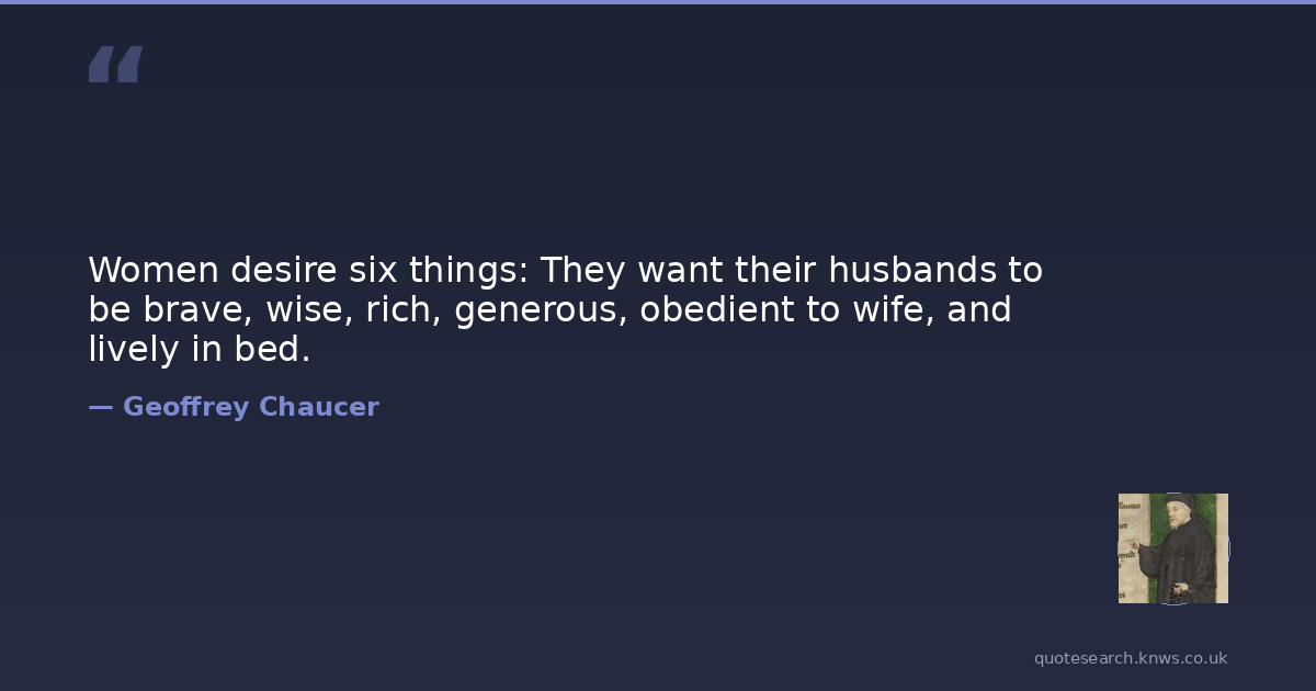 Women desire six things: They want their husbands to be brave, wise, rich, generous, obedient to wife, and lively in bed.
