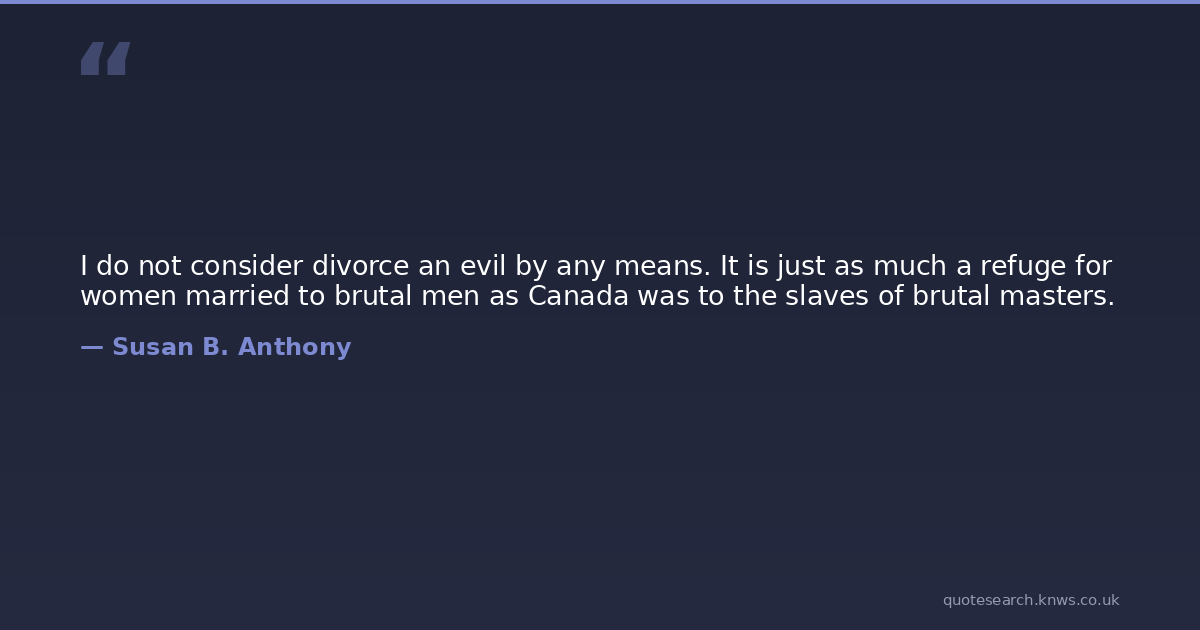 I do not consider divorce an evil by any means. It is just as much a refuge for women married to brutal men as Canada was to the slaves of brutal masters.