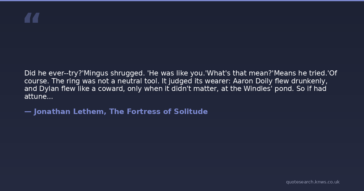 Did he ever--try?'Mingus shrugged. 'He was like you.'What's that mean?'Means he tried.'Of course. The ring was not a neutral tool. It judged its wearer: Aaron Doily flew drunkenly, and Dylan flew like a coward, only when it didn't matter, at the Windles' pond. So if had attuned to Robert Woolfolk's chaos.Don't tell me,' said Dylan. 'He flew sideways.'Mingus left it vague. He'd always made it his habit to protect their honor against one another--Dylan, Arthur, Robert. To say nothing.