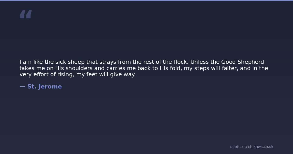 I am like the sick sheep that strays from the rest of the flock. Unless the Good Shepherd takes me on His shoulders and carries me back to His fold, my steps will falter, and in the very effort of rising, my feet will give way.