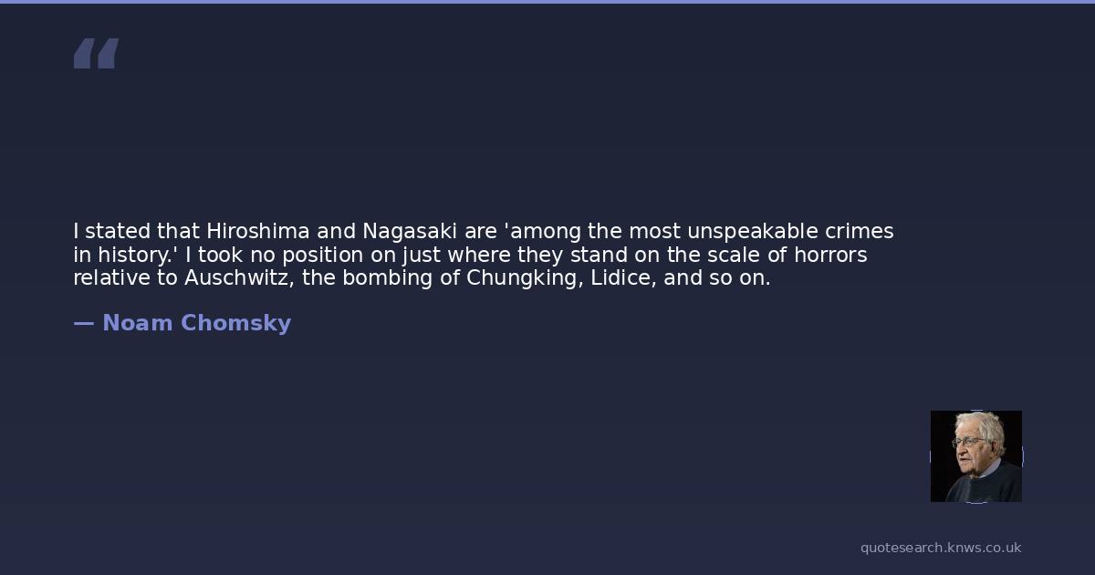 I stated that Hiroshima and Nagasaki are 'among the most unspeakable crimes in history.' I took no position on just where they stand on the scale of horrors relative to Auschwitz, the bombing of Chungking, Lidice, and so on.