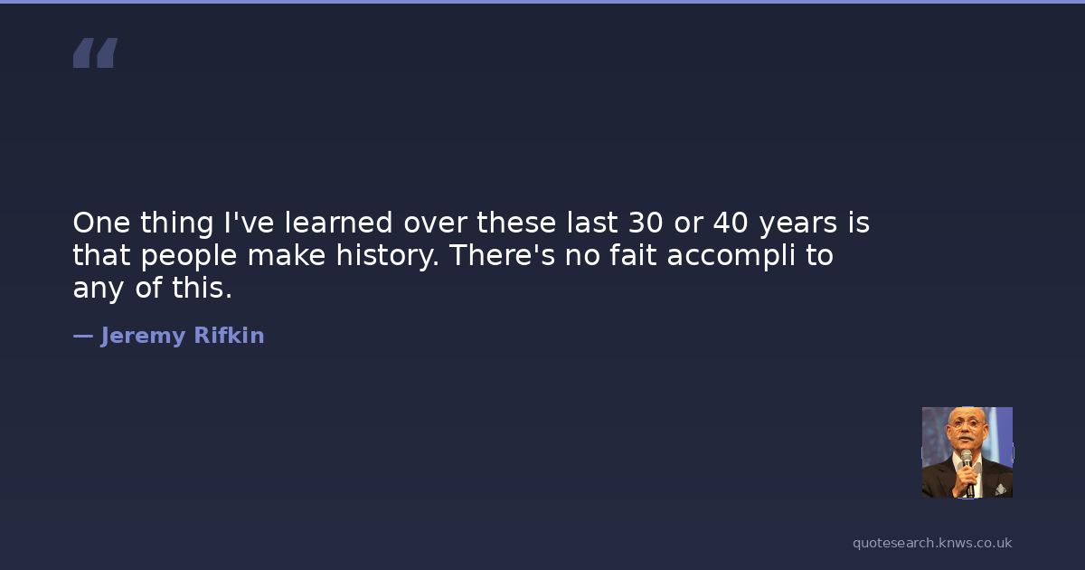 Jeremy Rifkin was a contemporary American economic and social theorist. Jeremy Rifkin is an American economic and social theorist, writer, public speaker, political advisor, and activist. Rifkin is the author of 23 books about the influence of scientific and technological changes on the economy, the workforce, society, and the environment. Read more on Wikipedia →