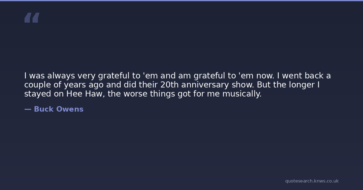 I was always very grateful to 'em and am grateful to 'em now. I went back a couple of years ago and did their 20th anniversary show. But the longer I stayed on Hee Haw, the worse things got for me musically.
