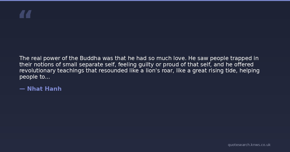 The real power of the Buddha was that he had so much love. He saw people trapped in their notions of small separate self, feeling guilty or proud of that self, and he offered revolutionary teachings that resounded like a lion's roar, like a great rising tide, helping people to wake up and break free from the prison of ignorance.