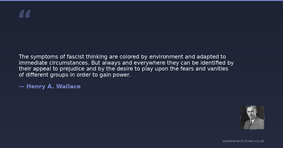 The symptoms of fascist thinking are colored by environment and adapted to immediate circumstances. But always and everywhere they can be identified by their appeal to prejudice and by the desire to play upon the fears and vanities of different groups in order to gain power.