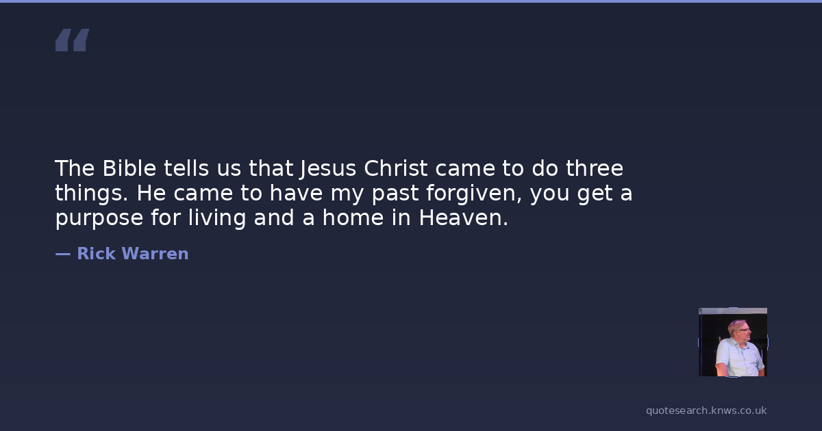 The Bible tells us that Jesus Christ came to do three things. He came to have my past forgiven, you get a purpose for living and a home in Heaven.