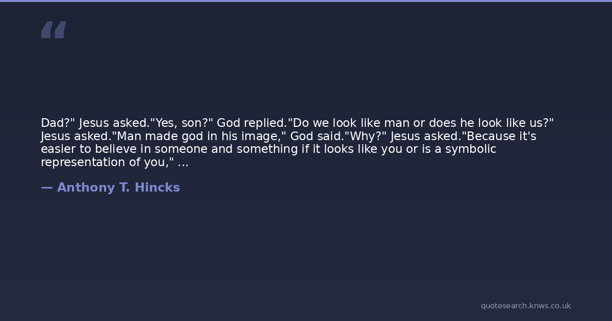 Dad?" Jesus asked."Yes, son?" God replied."Do we look like man or does he look like us?" Jesus asked."Man made god in his image," God said."Why?" Jesus asked."Because it's easier to believe in someone and something if it looks like you or is a symbolic representation of you," God answered."If that's true. What do we look like then?" Jesus asked.God smiled, "We look like everything."Jesus laughed, "Could I look like a giraffe then?""Yes, if the giraffe believes in you," God laughed.Jesus smiled and had tears of joy in his eyes.