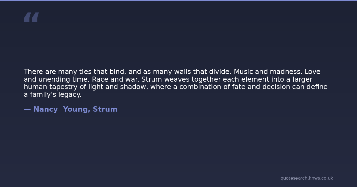 There are many ties that bind, and as many walls that divide. Music and madness. Love and unending time. Race and war. Strum weaves together each element into a larger human tapestry of light and shadow, where a combination of fate and decision can define a family's legacy.