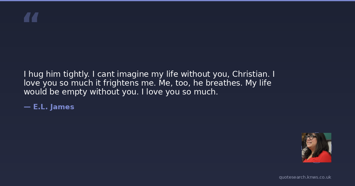 I hug him tightly. I cant imagine my life without you, Christian. I love you so much it frightens me. Me, too, he breathes. My life would be empty without you. I love you so much.