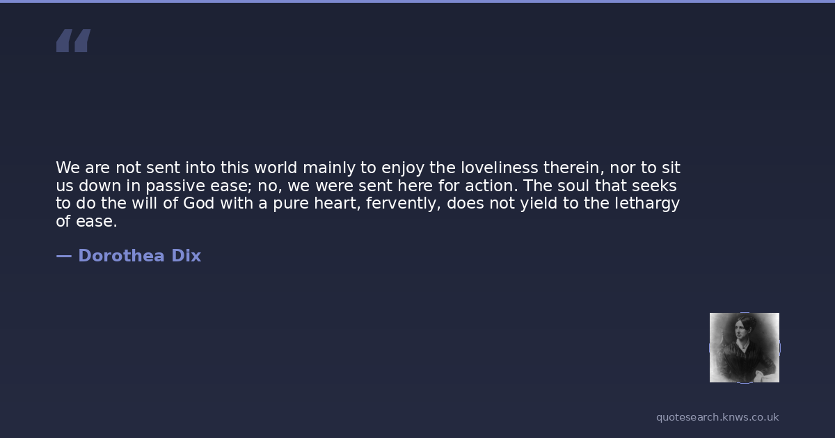 We are not sent into this world mainly to enjoy the loveliness therein, nor to sit us down in passive ease; no, we were sent here for action. The soul that seeks to do the will of God with a pure heart, fervently, does not yield to the lethargy of ease.