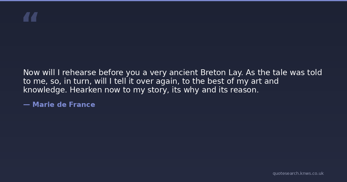 Now will I rehearse before you a very ancient Breton Lay. As the tale was told to me, so, in turn, will I tell it over again, to the best of my art and knowledge. Hearken now to my story, its why and its reason.