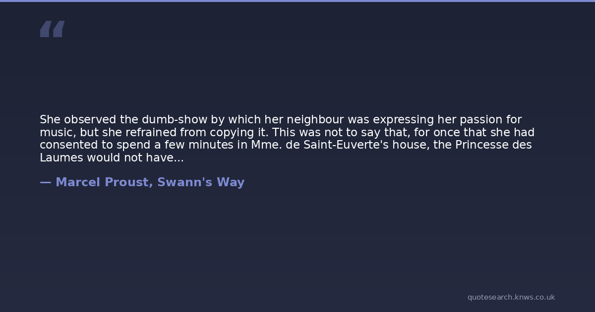 She observed the dumb-show by which her neighbour was expressing her passion for music, but she refrained from copying it. This was not to say that, for once that she had consented to spend a few minutes in Mme. de Saint-Euverte's house, the Princesse des Laumes would not have wished (so that the act of politeness to her hostess which she had performed by coming might, so to speak, 'count double') to shew herself as friendly and obliging as possible. But she had a natural horror of what she called 'exaggerating,' and always made a point of letting people see that she 'simply must not' indulge in any display of emotion that was not in keeping with the tone of the circle in which she moved, although such displays never failed to make an impression upon her, by virtue of that spirit of imitation, akin to timidity, which is developed in the most self-confident persons, by contact with an unfamiliar environment, even though it be inferior to their own. She began to ask herself whether these gesticulations might not, perhaps, be a necessary concomitant of the piece of music that was being played, a piece which, it might be, was in a different category from all the music that she had ever heard before; and whether to abstain from them was not a sign of her own inability to understand the music, and of discourtesy towards the lady of the house; with the result that, in order to express by a compromise both of her contradictory inclinations in turn, at one moment she would merely straighten her shoulder-straps or feel in her golden hair for the little balls of coral or of pink enamel, frosted with tiny diamonds, which formed its simple but effective ornament, studying, with a cold interest, her impassioned neighbour, while at another she would beat time for a few bars with her fan, but, so as not to forfeit her independence, she would beat a different time from the pianist's.