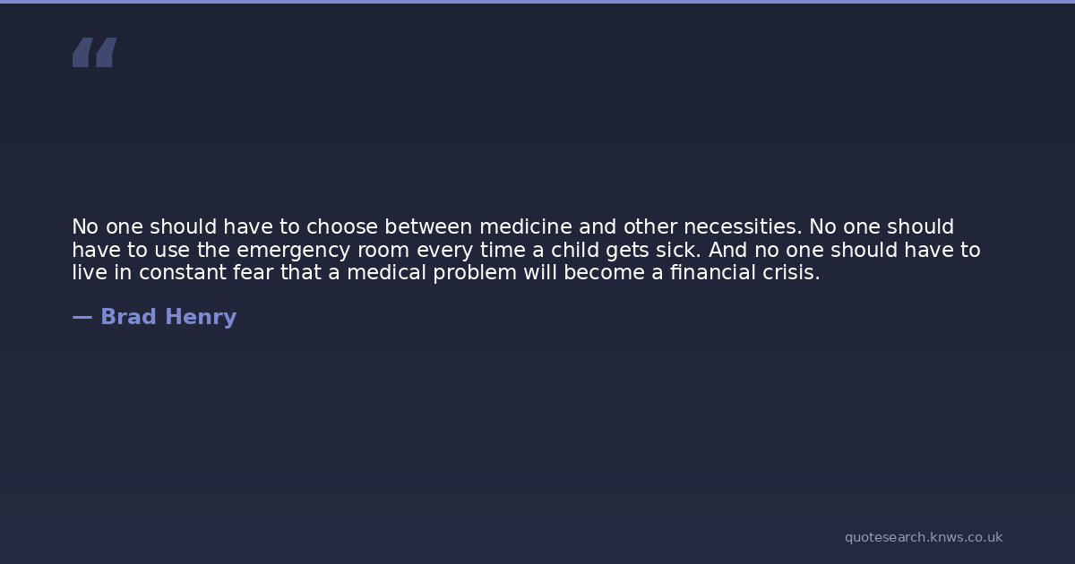 No one should have to choose between medicine and other necessities. No one should have to use the emergency room every time a child gets sick. And no one should have to live in constant fear that a medical problem will become a financial crisis.