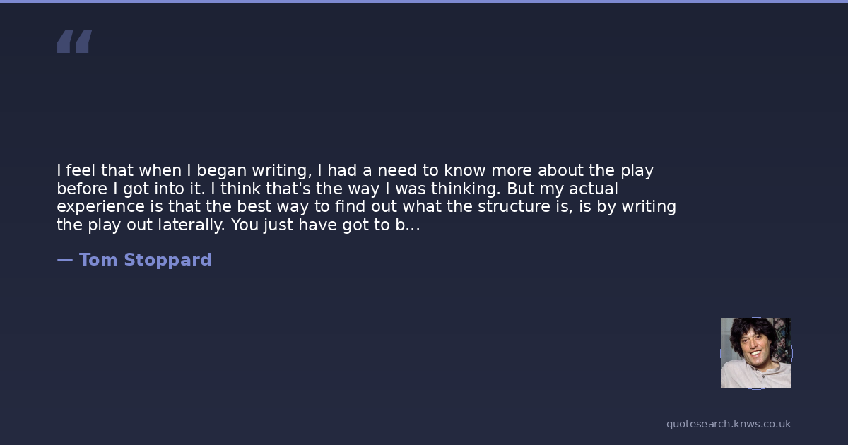I feel that when I began writing, I had a need to know more about the play before I got into it. I think that's the way I was thinking. But my actual experience is that the best way to find out what the structure is, is by writing the play out laterally. You just have got to be brave enough to start without knowing where you are going.