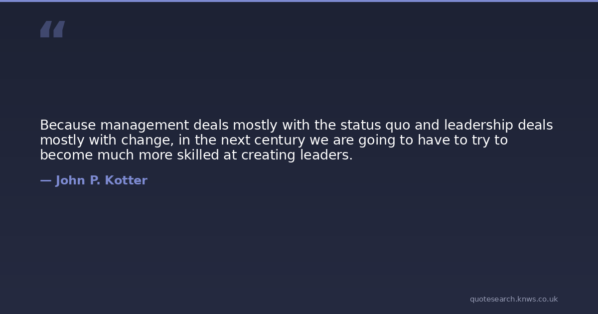 Because management deals mostly with the status quo and leadership deals mostly with change, in the next century we are going to have to try to become much more skilled at creating leaders.