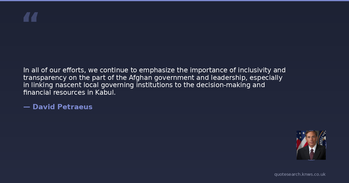 In all of our efforts, we continue to emphasize the importance of inclusivity and transparency on the part of the Afghan government and leadership, especially in linking nascent local governing institutions to the decision-making and financial resources in Kabul.