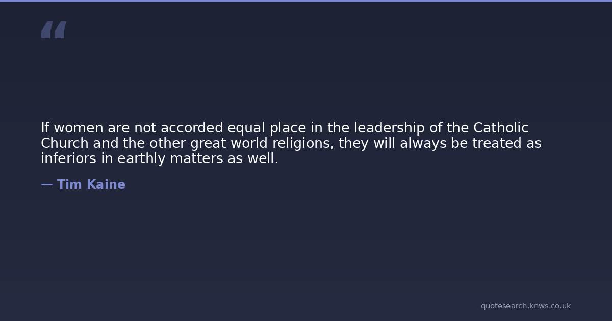 If women are not accorded equal place in the leadership of the Catholic Church and the other great world religions, they will always be treated as inferiors in earthly matters as well.