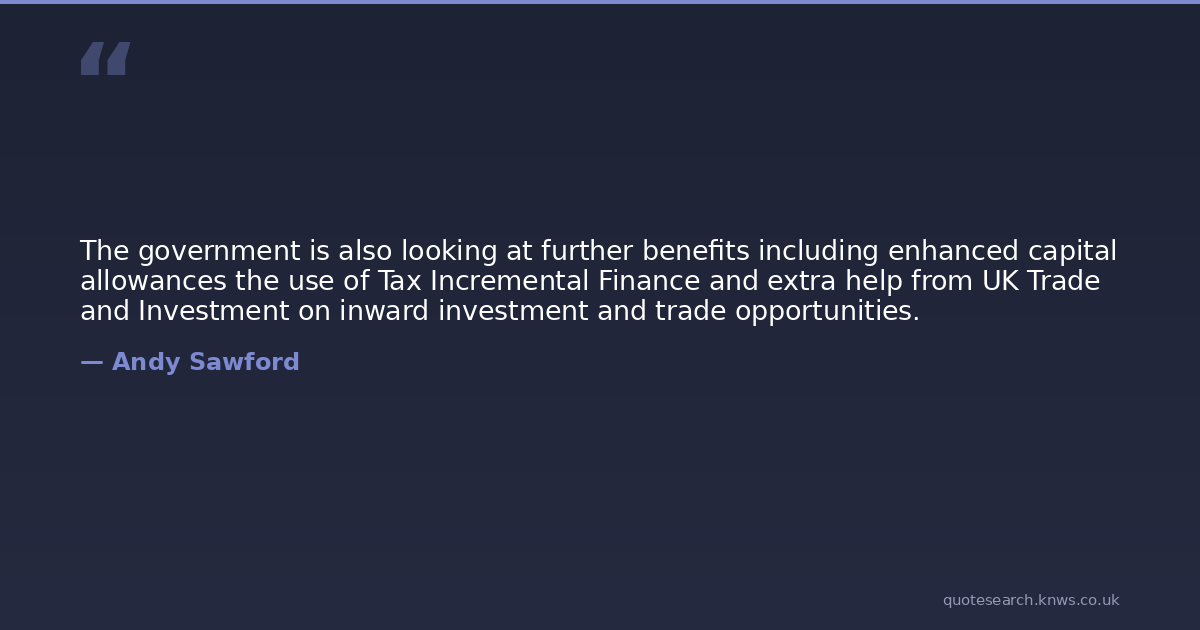 The government is also looking at further benefits including enhanced capital allowances the use of Tax Incremental Finance and extra help from UK Trade and Investment on inward investment and trade opportunities.