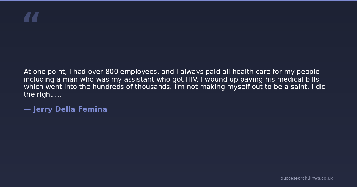 At one point, I had over 800 employees, and I always paid all health care for my people - including a man who was my assistant who got HIV. I wound up paying his medical bills, which went into the hundreds of thousands. I'm not making myself out to be a saint. I did the right thing.