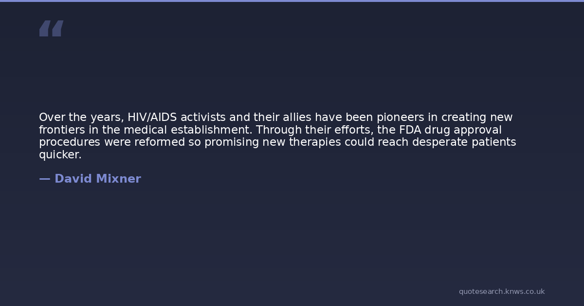 Over the years, HIV/AIDS activists and their allies have been pioneers in creating new frontiers in the medical establishment. Through their efforts, the FDA drug approval procedures were reformed so promising new therapies could reach desperate patients quicker.