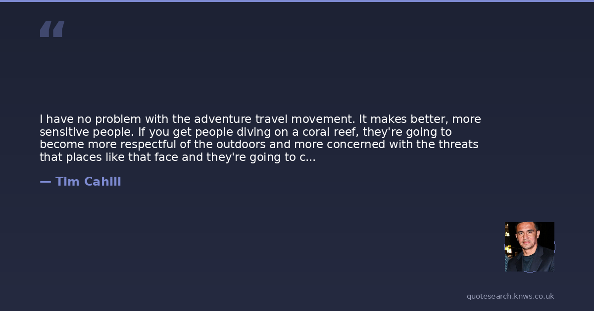 I have no problem with the adventure travel movement. It makes better, more sensitive people. If you get people diving on a coral reef, they're going to become more respectful of the outdoors and more concerned with the threats that places like that face and they're going to care more about protecting them than they would have before.