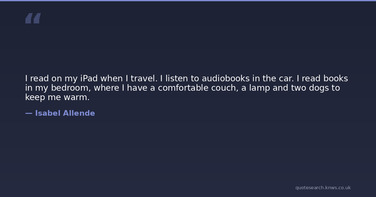 I read on my iPad when I travel. I listen to audiobooks in the car. I read books in my bedroom, where I have a comfortable couch, a lamp and two dogs to keep me warm.